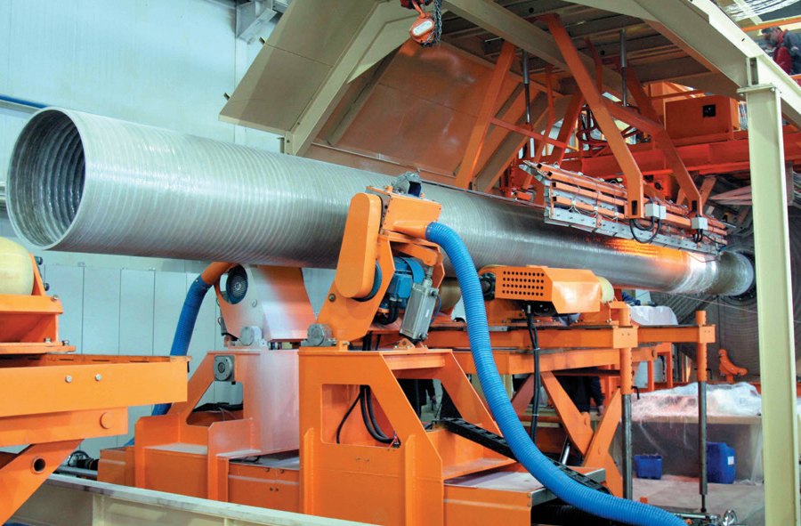 However, the traditional manufacturing process is labour intensive and slower than the process we have developed, which allows for highly efficient continuous production of pipe at greater speeds with less labour. This process also removes the limitation of having to make FRP pipe to a standard length and has a low loss of raw materials, meaning very little waste when considering environmental concerns.